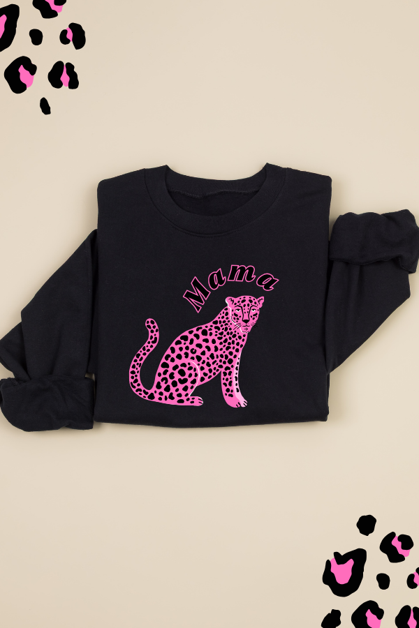 Featuring a striking hot pink leopard graphic with “Mama” arched above, this sweatshirt blends softness with serious attitude. Set on a classic black base, the design pops while staying effortlessly wearable—perfect for school runs, coffee dates, or cosy days at home.